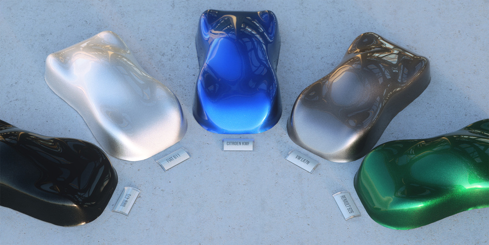 This bundle includes 5 accurate metallic car paints (manufacturer codes specified below), created using real world references of painted speed shapes, taken under controlled lighting and compared with rendered samples.